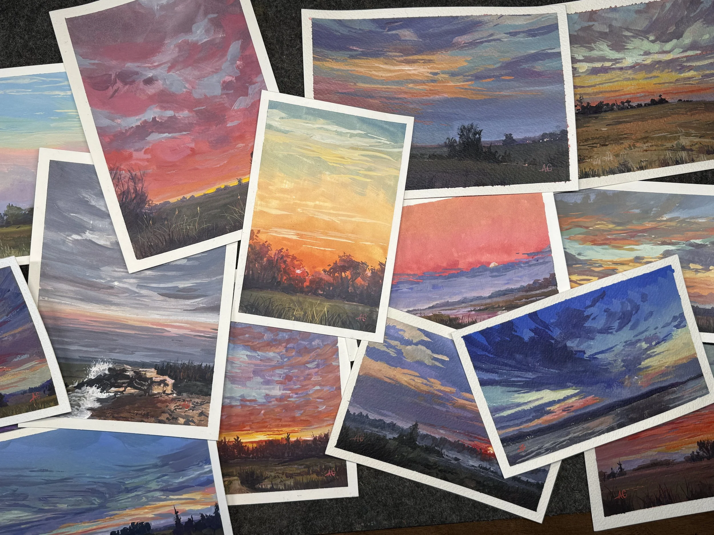 “At Last Light” became my way of slowing down enough to notice what the day was giving me. Little 4x6s and 5x7s painted during lunch breaks, after work, on nights where I should’ve gone to bed but didn’t because the sky that day was begging to be painted. These aren’t big, dramatic, “capital A Art” scenes. They’re just the Midwest being the Midwest. Quiet roads. Warm windows. A sliver of orange before everything slips into blue. They’re sketches that go well beyond sketching.